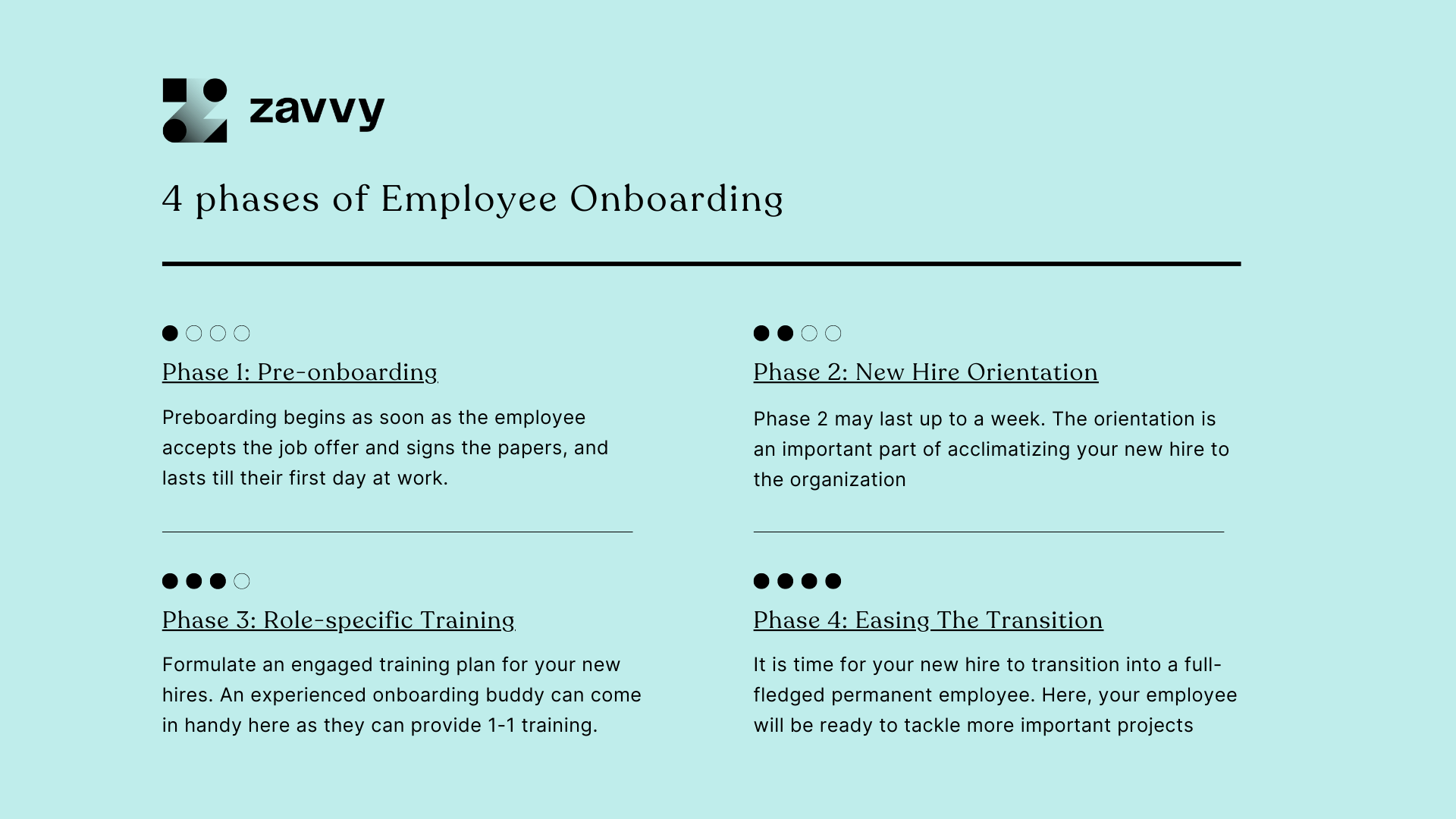 Once the training period is over, it is time for your new hire to transition into a full-fledged permanent employee. From this phase onwards, your employee will be ready to tackle more critical projects and report directly to their immediate supervisor.
