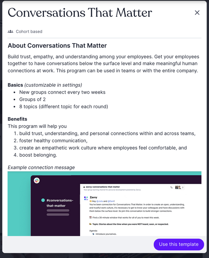 Für die bestmögliche Vernetzung aller Beschäftigten im Unternehmen haben wir ein Vernetzungsprogramm entwickelt, mit dem sich Ihre Angestellten automatisch auf Slack oder Microsoft Teams verbinden können. Ob für ein virtuelles Treffen zwischendurch, für bedeutungsvolle Gespräche oder für Meetings – mit diesem Programm kann sich Ihr ganzes Team auf einer viel tieferen Ebene verbinden, da entscheidende Fragen besprochen und nachhaltige Beziehungen aufgebaut werden.