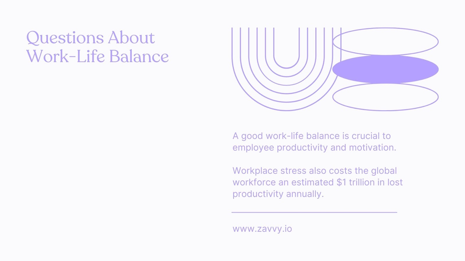A good work-life balance is crucial to employee productivity and motivation. It's also an important part of maintaining a healthy lifestyle. Employers must strive to help their team members achieve healthy work-life harmony. Why? Along with being the right thing to do, workplace stress also costs the global workforce an estimated $1 trillion in lost productivity annually. Check how your employees feel about the following statements: