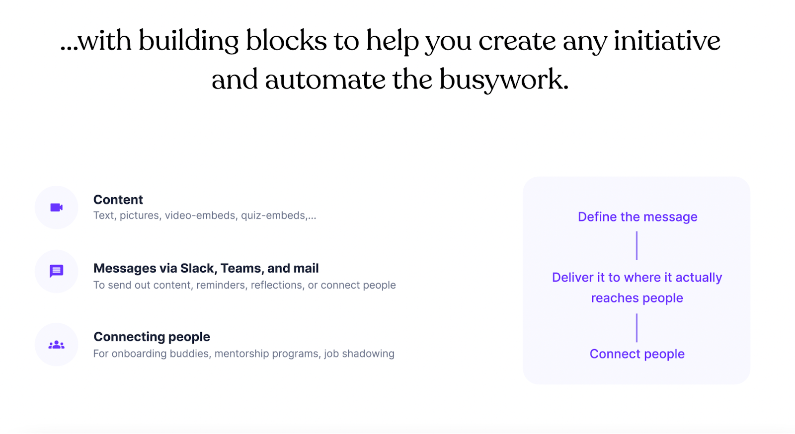 Using tools like Slack and Teams helps to efficiently deliver all the content in a timely, and a structured manner. They are easily accessible and scalable, while making it possible for you to track your new hire’s progress.