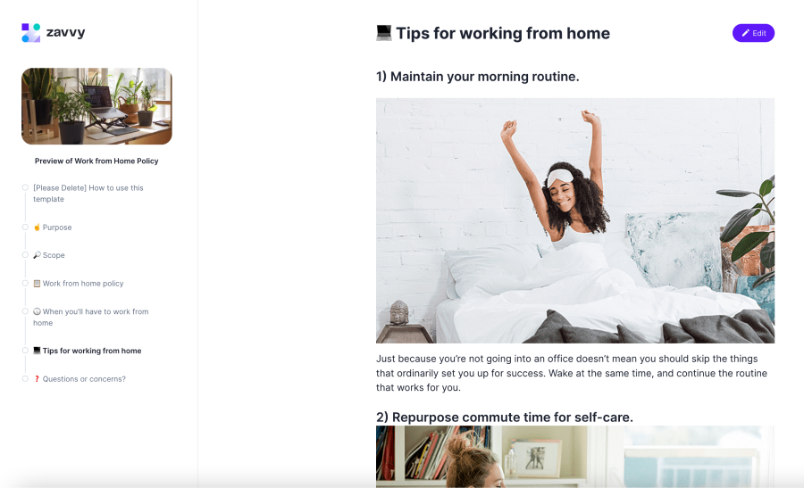 Remote work policy: The policy states management's expectations for remote employees. It includes the working hours expected, legal working conditions, cybersecurity requirements, and so on. Plus, it contains employees' legal rights and company benefits, etc.