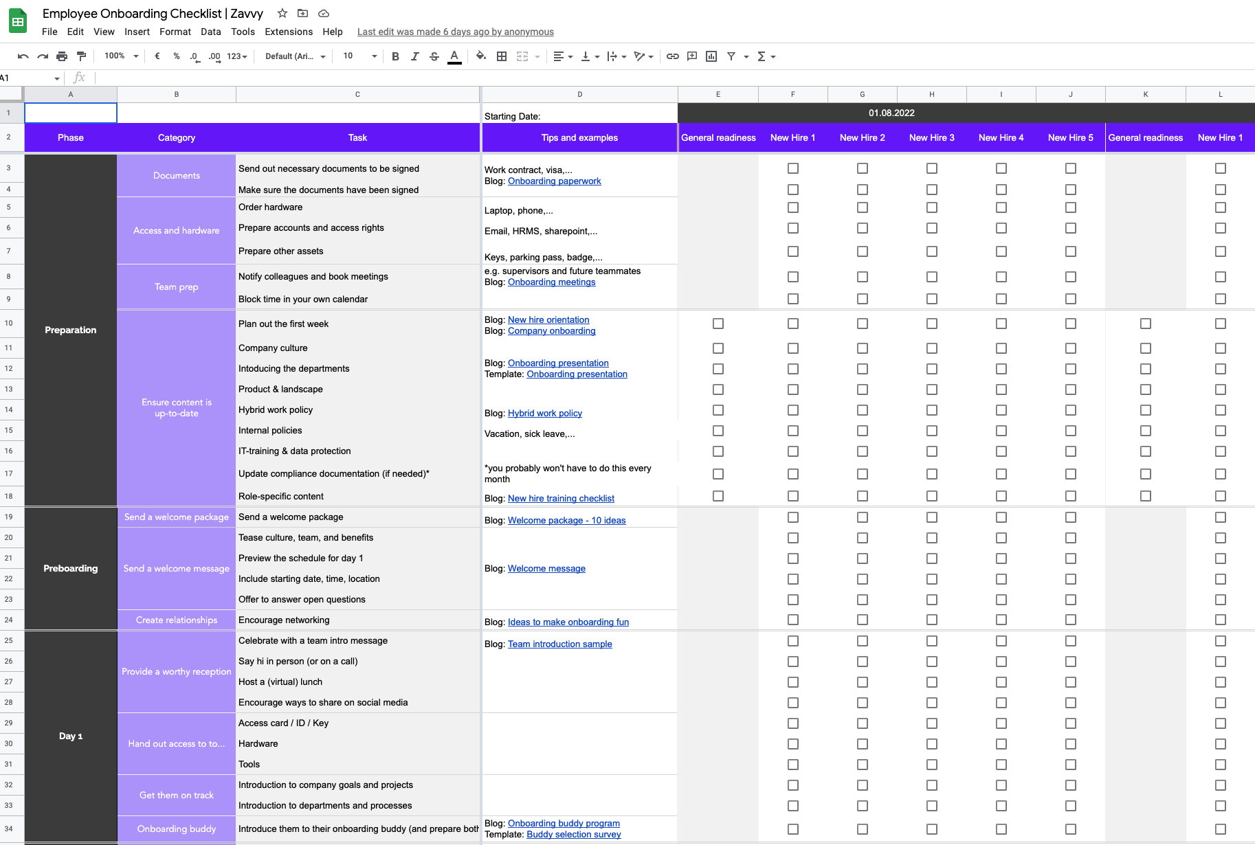Als Nächstes stellen Sie alle Ressourcen und Hilfsmittel zusammen, die Sie zur Erledigung der Aufgaben in Ihrer Onboarding-Checkliste benötigen. Fügen Sie diese in eine Spalte neben jeder Aufgabe ein. Verwenden Sie schließlich Kontrollkästchen, Farbcodierung oder bedingte Formatierung, um Ihren Fortschritt in der Vorlage der Onboarding-Checkliste zu verfolgen.