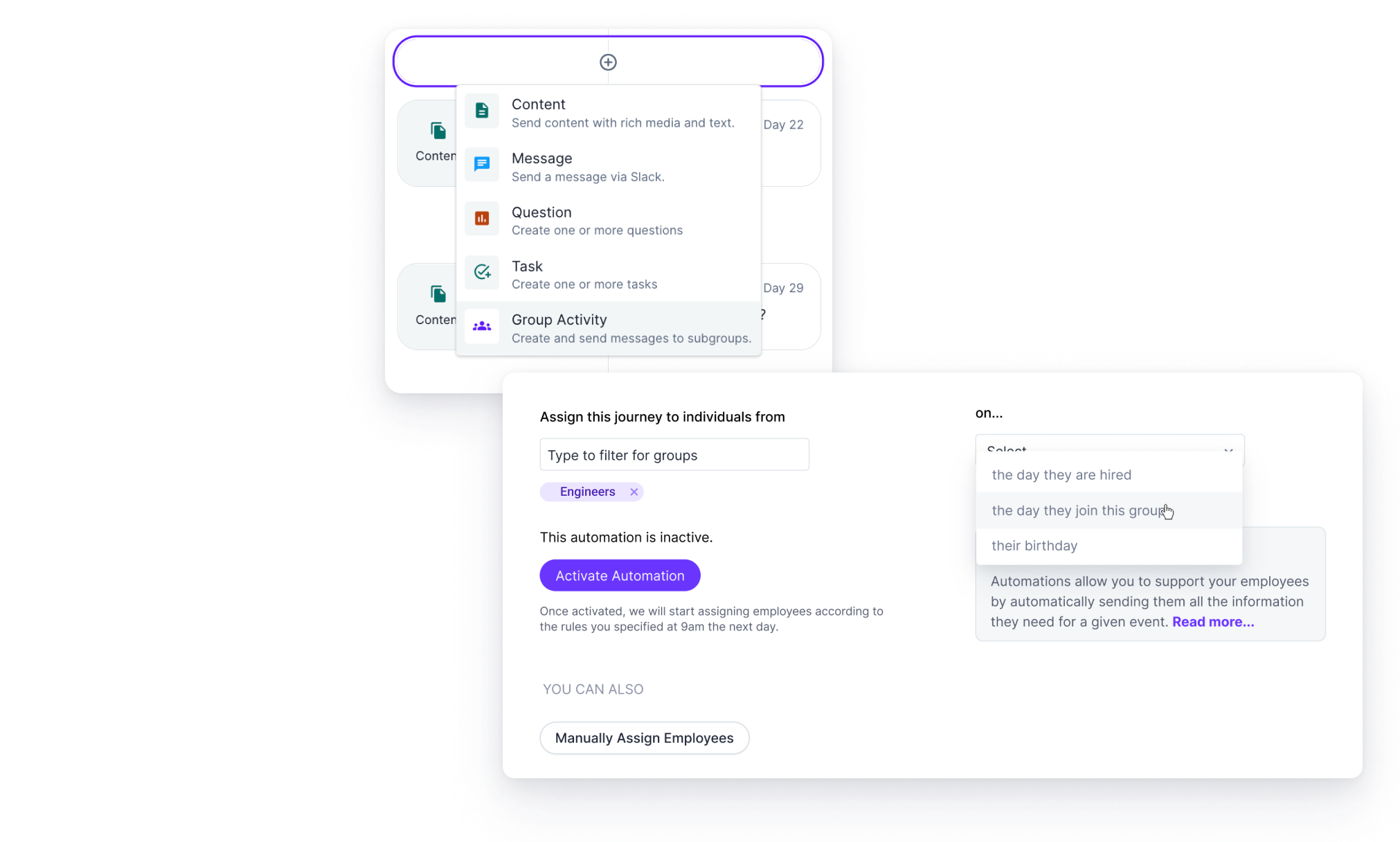 Create assignment procedure to automatically enroll employees into courses based on criteria or repeat them on a regular basis. Take people on training journeys that engage them for days, weeks, or months - including reminders via Slack, MS Teams, or email and even social events. Set up once, engage forever.