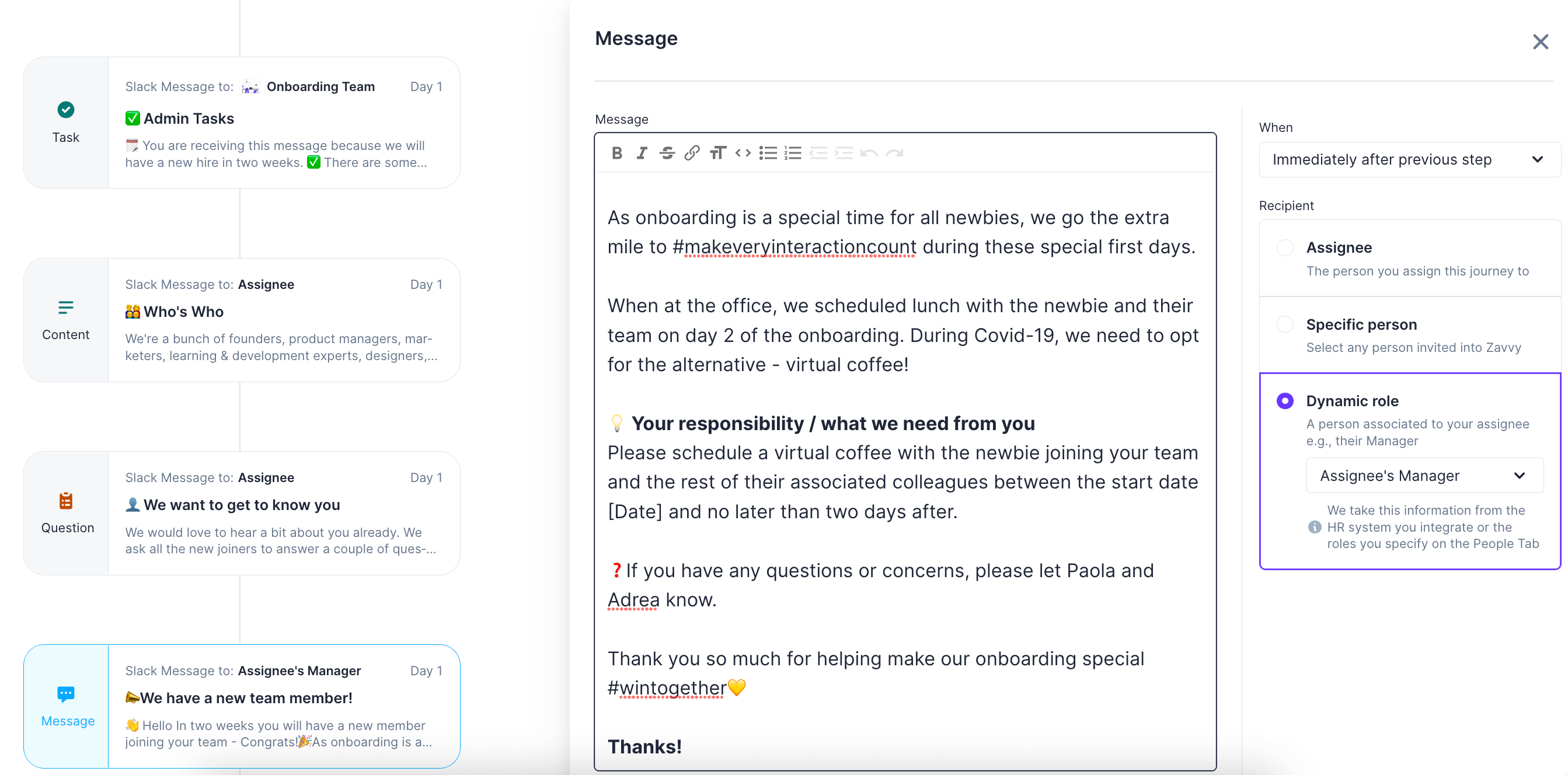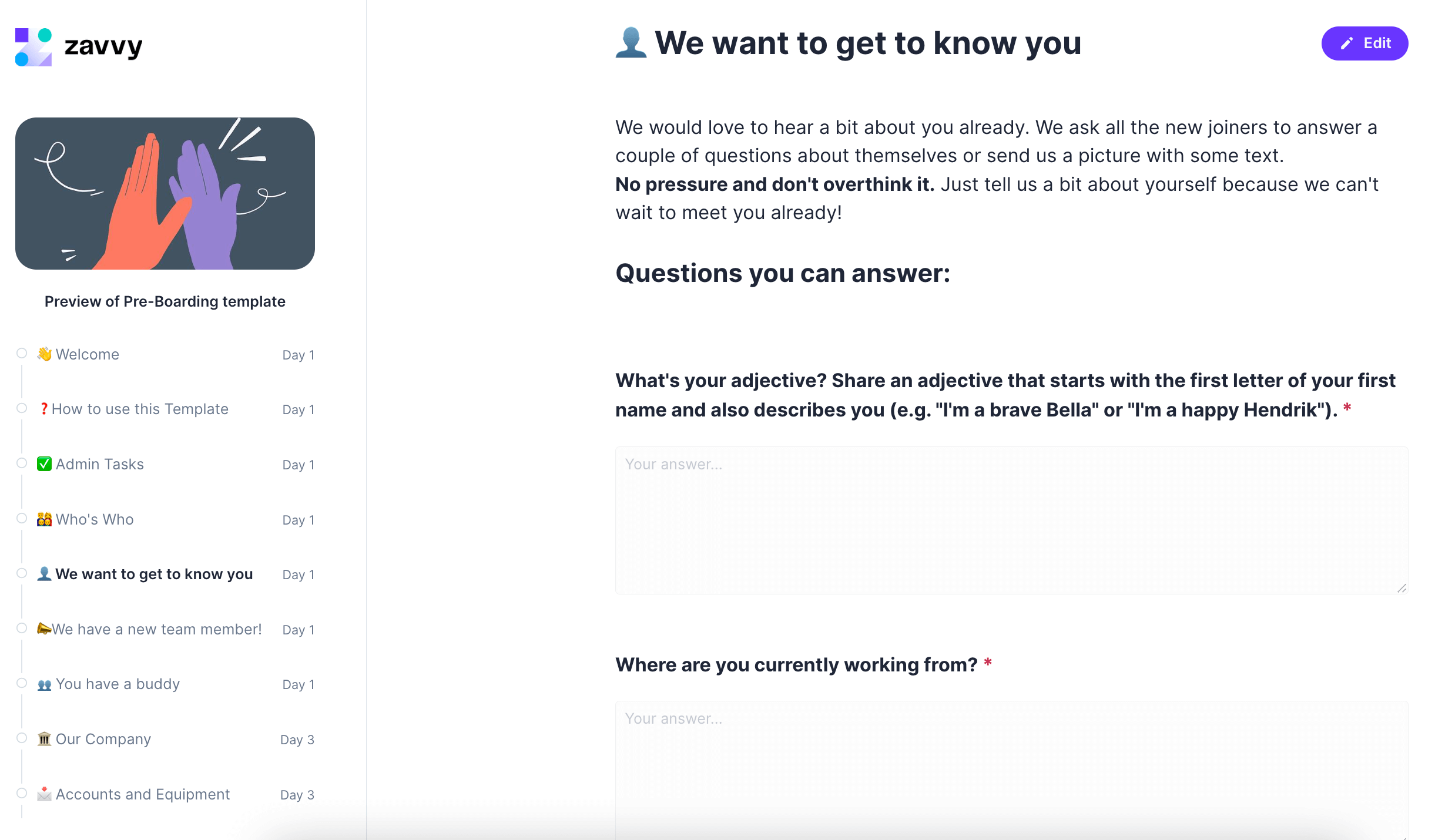 First-day jitters are very real. And information on your first day can be overwhelming. Therefore, we want to reduce this unnecessary stress by pre-boarding you. The pre-boarding journey will give you the information on the most important things at [the company] before you will officially get started. More importantly, you will also get the chance to meet all of us. Go through the different activities, and feel free to reach out if you have any questions along the way.