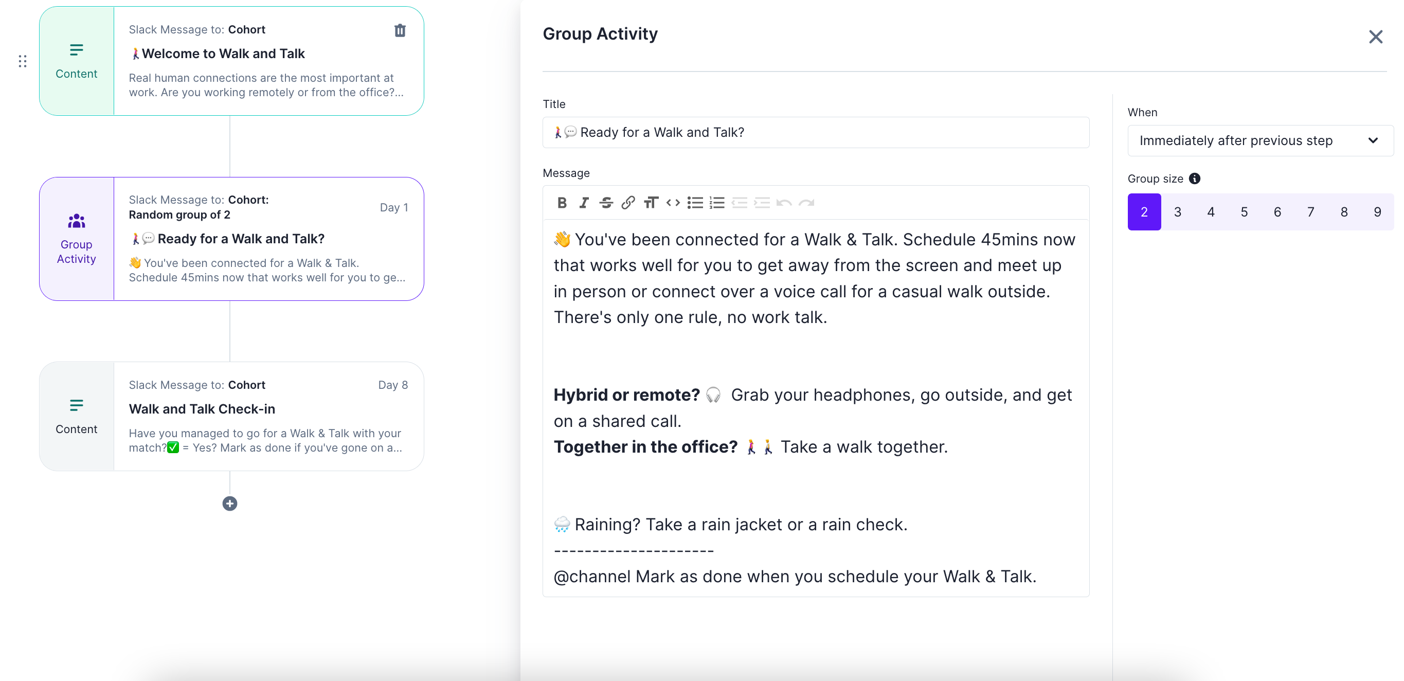 Use this template to organize long walks between your employees in person, or in a hybrid set-up. Can be used in teams or with the entire company.